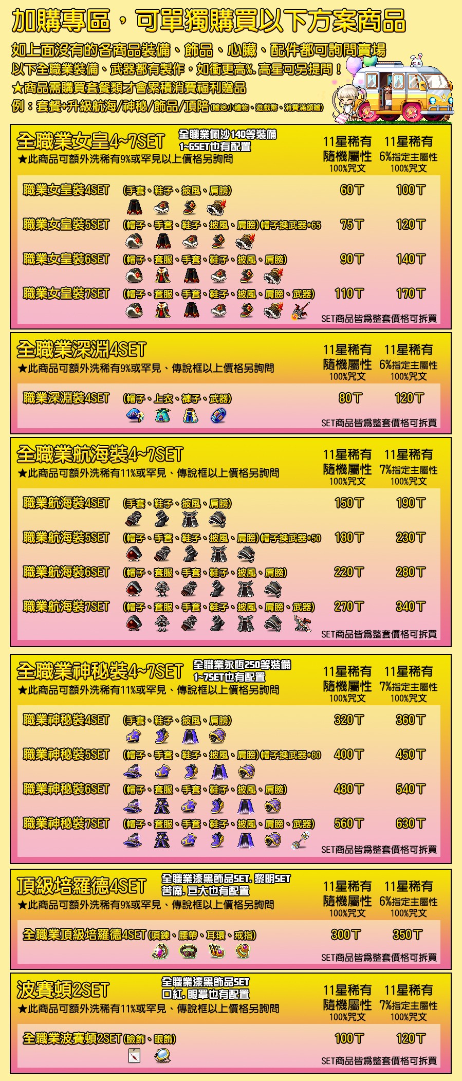 例如:伺服器:艾麗亞 職業:凱內西斯,限量款套餐,升級1.V武器+2.傳說武器+3.130魔心臟+6.升級4S頂培