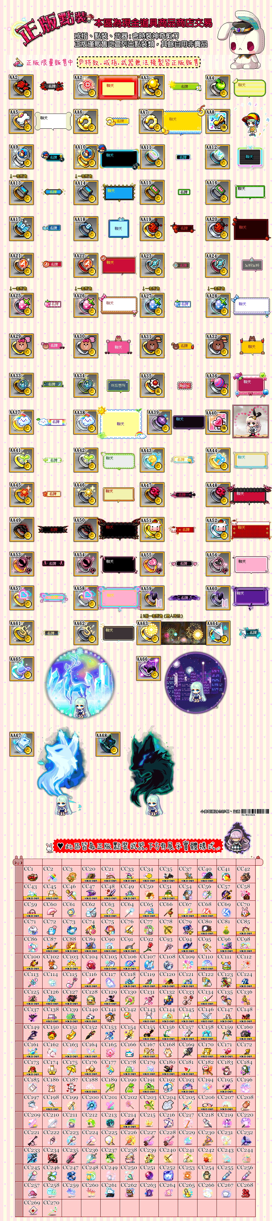 例如:伺服器:艾麗亞 職業:凱內西斯,限量款套餐,升級1.V武器+2.傳說武器+3.130魔心臟+6.升級4S頂培