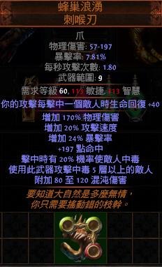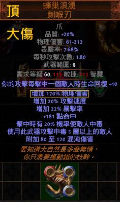 道具 【標準】 蜂巢浪湧 刺喉刃(疊毒專用)【頂+170%物理增傷+攻速暴擊+機率中毒】