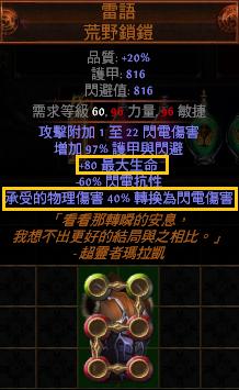 道具 【標準】 絕版6L雷語 荒野鎖鎧雷甲【+80生命】承受的物理傷害40%轉為閃電傷害