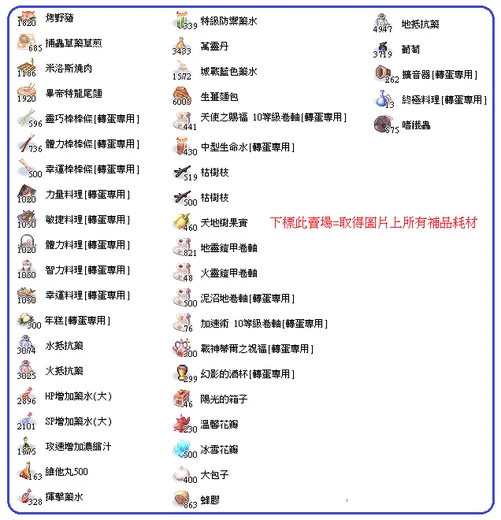 如圖全部補品耗材/下標全部帶走/10/20料/棒條/天果/大包子/特級水/鎧甲捲