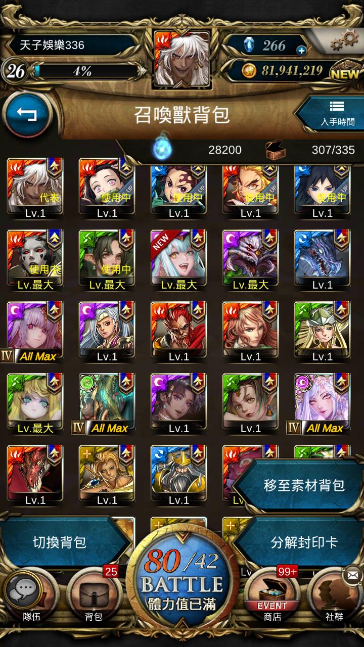 莉莉絲+神創+魔滅+莫尼亞蒂AM+隨機黑金2~8張+隨機白金350~450張+背包空間400格以上+西遊神自選ALL MAX+希臘自選ALL MAX+魔法石700~800顆以上+靈魂破萬+公會KEY破千+週年慶ALL MAX自選300級 0進度+沒過劇情己免費練至 目前等級:300級 2000元