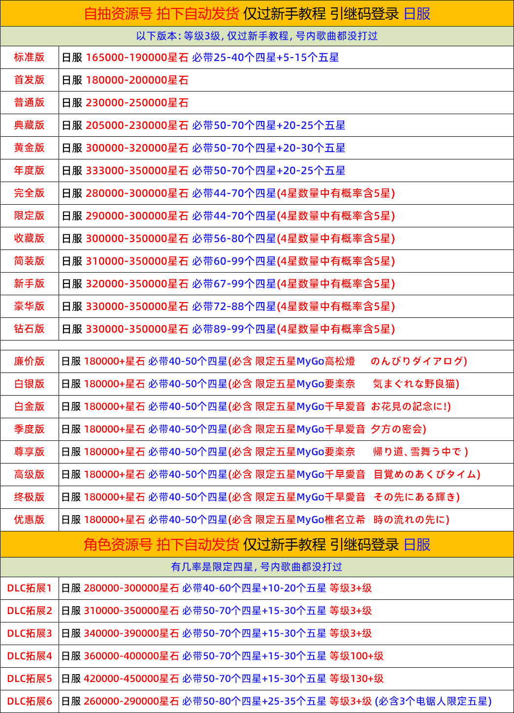 DLC2=15-25五星+50-70四星 310000~315000鑽,僅過新手教程,0進度初始號,沒有讀故事和打歌,安全不封號