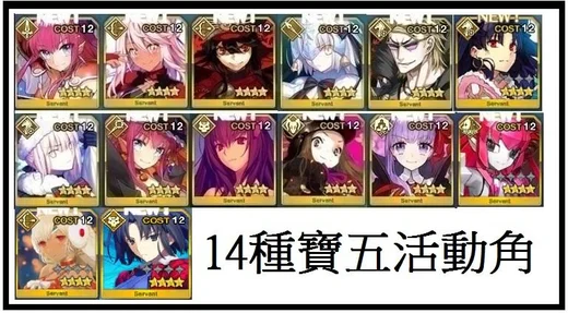 14種寶5活動4星角:術龍娘+騎金時+殺師匠+小黑+劍龍娘+聖誕黑傻+聖誕幼貞+信長+茶茶+BB+騎凜+機龍娘+弓提拉+殺兩儀式