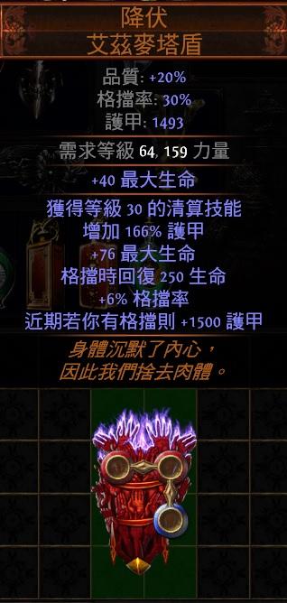 道具 😊幸運PoE😊傳奇-降伏.艾茲麥塔盾(格擋時+250生命+1500護甲 )