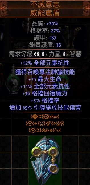 道具 😊幸運PoE😊傳奇-不滅意志.威能鳶盾(召喚專注神諭技能+引導施放技能傷害)