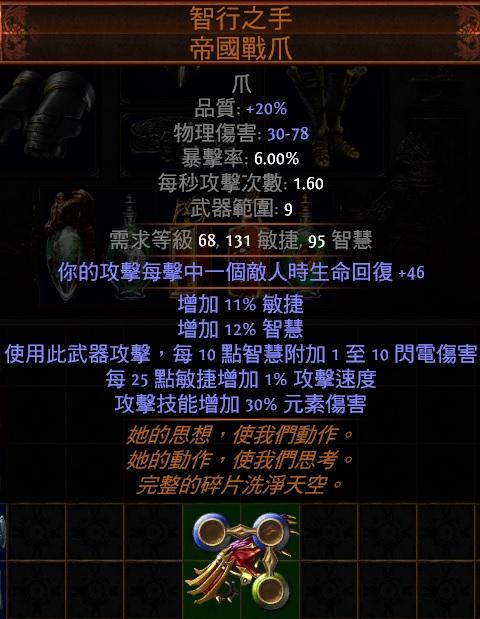 道具 😊幸運PoE😊傳奇-智行之手.帝國戰爪(每10點智慧附加1-10閃電傷害)