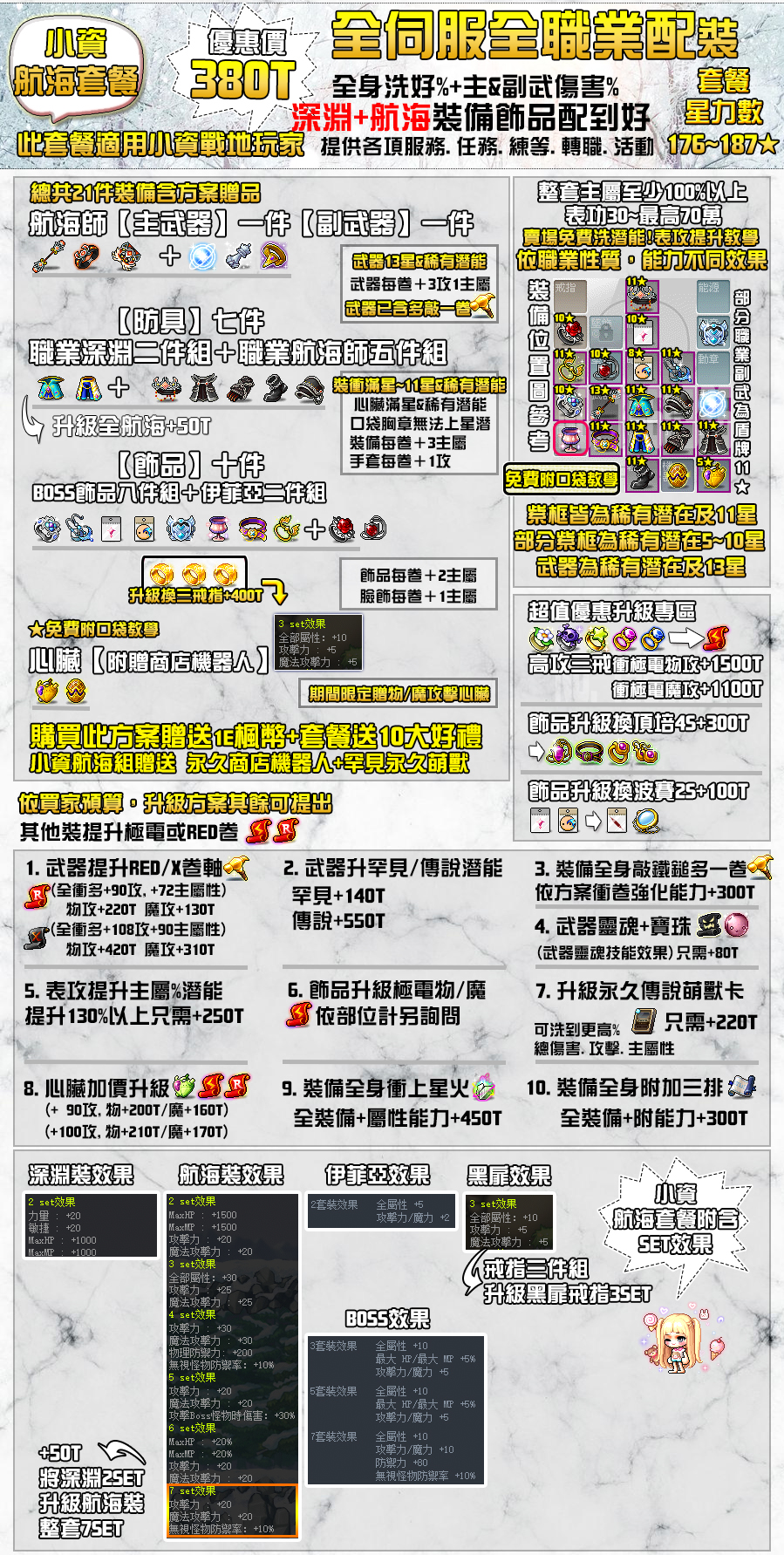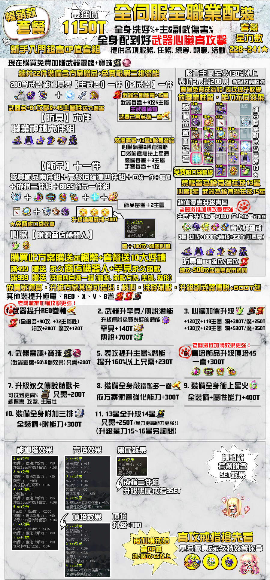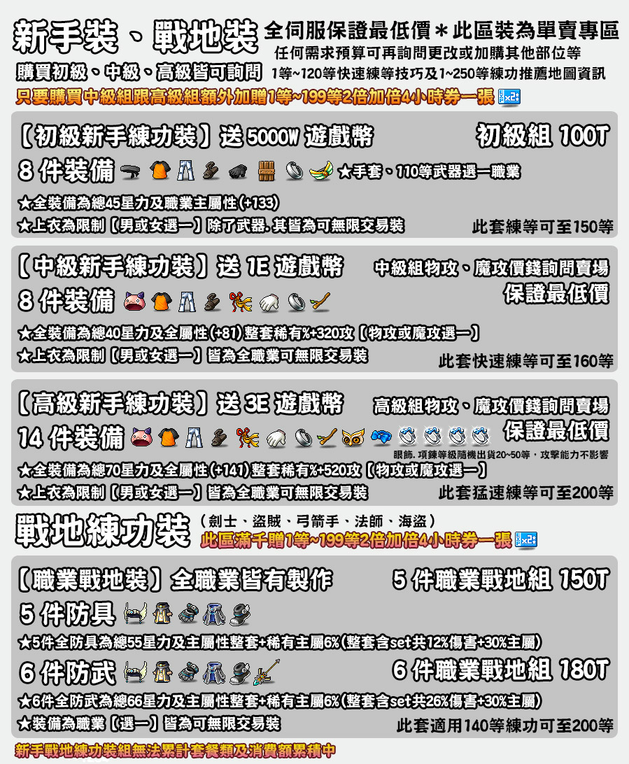 總套組懶人包(加購專區及裝備配置詳細於圖上):以下不含練等(練等僅接燃燒時段)