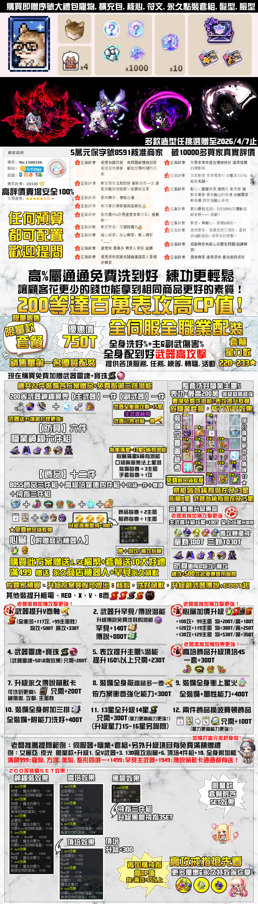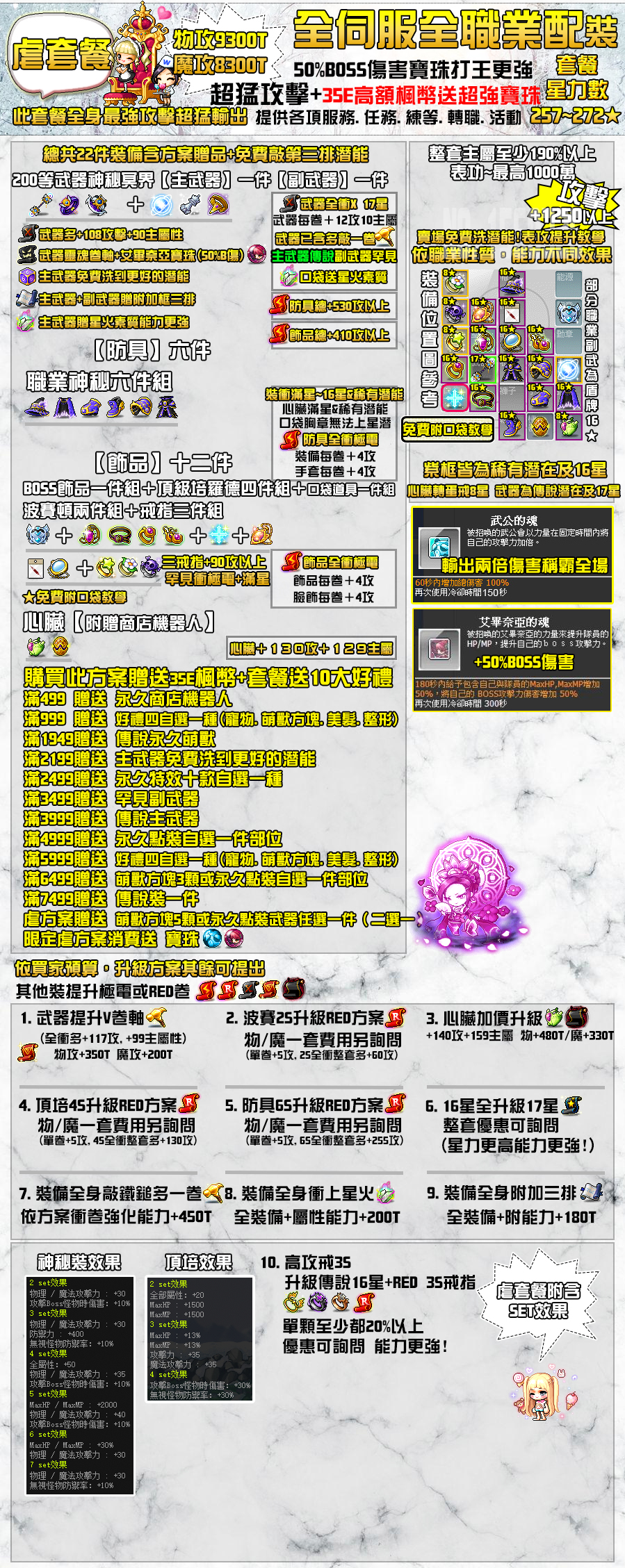 例如:伺服器:艾麗亞 職業:凱內西斯,限量款套餐,升級1.V武器+2.傳說武器+3.130魔心臟+6.升級4S頂培