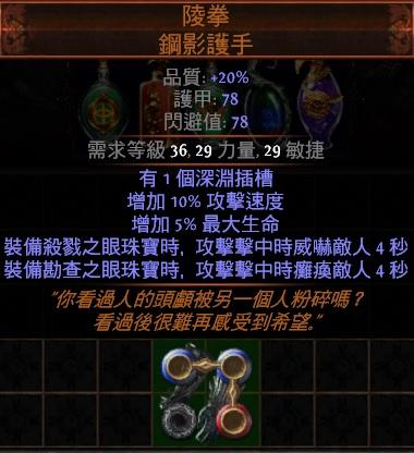 道具 😊幸運PoE😊遺產傳奇-陵拳.鋼影護手(有2個深淵插槽+攻速+威嚇+癱瘓 )