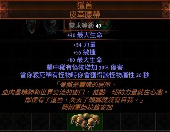 道具 😊幸運PoE專賣店😊傳奇-獵首.皮革腰帶(力量+敏捷+擊中稀有怪30%傷害)