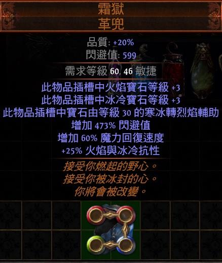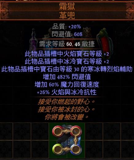 道具 😊幸運PoE😊傳奇-霜獄.革兜(插槽中等級+3火焰、冰冷寶石)寒冰轉烈焰輔助