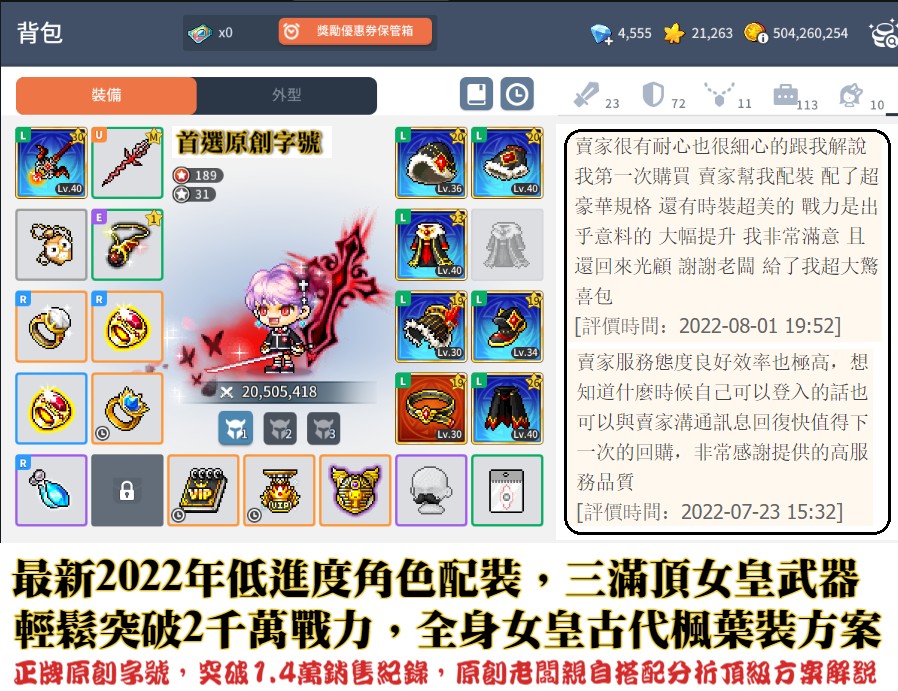 保證:頂楓葉神話紅底武器18-27星(滿等)+ 神話楓葉紅底裝X2~4 (滿等) + 神話裝X3~5 (全身滿等) + 輔助滿星(楓葉底)、160~180星、戰力200~500萬↑、楓葉紋章能力,靈魂附魔,王首飾(機率)