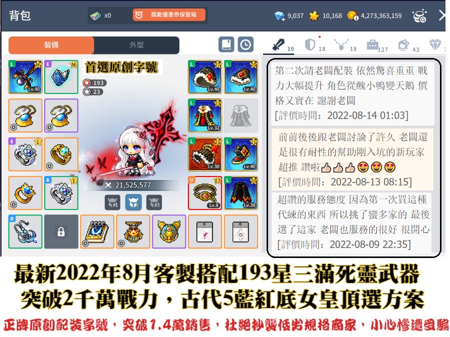 保證:楓葉神話紅底武器17-24星(滿等)+ 神話裝X4~5 + 傳說裝X3 + 輔助滿星(楓葉底)、150~165星、戰力150~250萬↑、楓葉紋章能力、靈魂附魔,王首飾(機率)