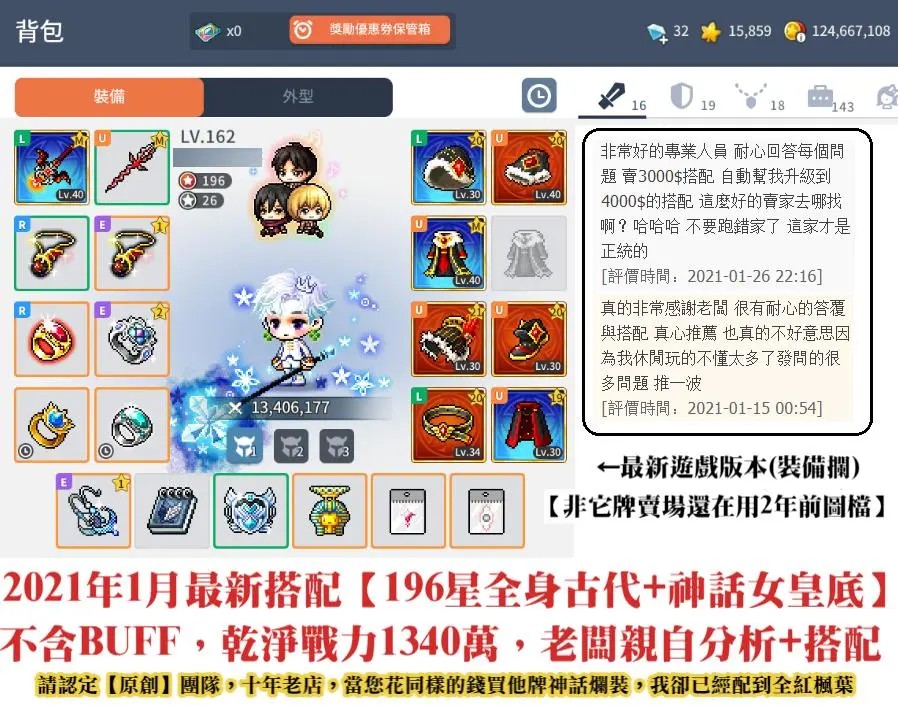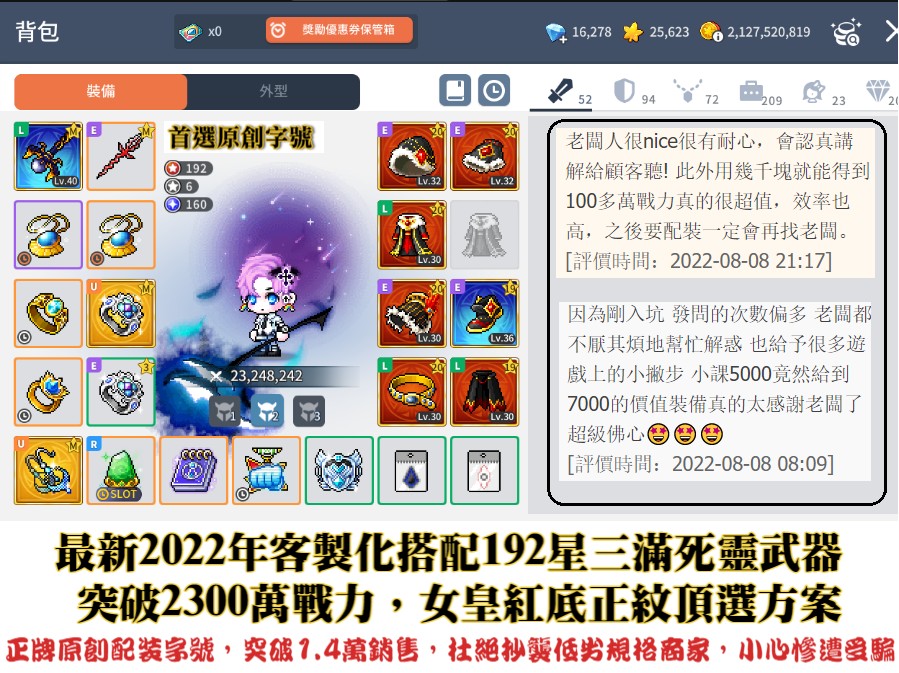 保證:楓葉神話紅底武器16-20星(滿等)+ 神話裝X2~3 + 傳說裝X5 + 輔助滿星、135~145星、戰力100~150萬↑、楓葉紋章能力、靈魂附魔、王首飾(機率)