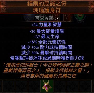 道具 😊PoE😊傳奇-福爾的忠誠之符.瑪瑙護身符、沉默之雷.雷錘(閃電技能連鎖+1