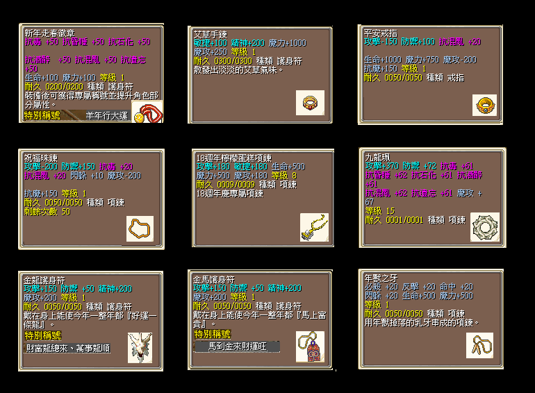 【祝福珠鍊1個10T】:推薦給戰鬥系/法術系練技能使用,搭配平安戒指更優