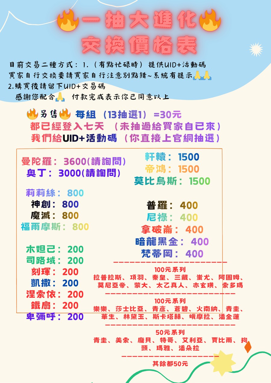 =======(各帳號都可加購項羽MAX+500、潛解龐貝MAX+300、潛解鐵扇MAX+500)以下附送過年直接升級福袋包購買的卡片升級all max包不用辛苦打素材=======