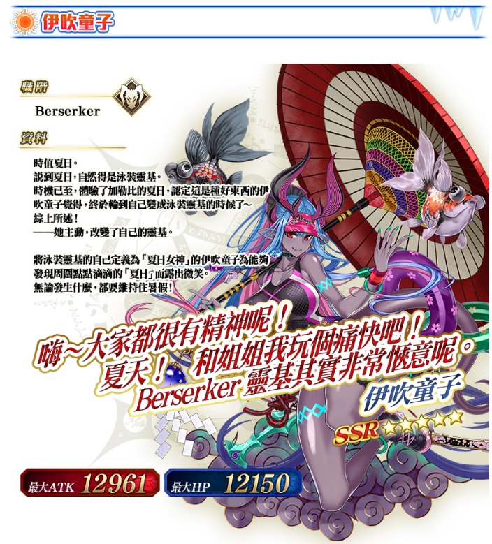 E115:泳伊吹+伊吹*2+奧伯龍+殺狐*2+術傻+梅林+阿蒂拉+弓傻+不夜術+藍傻+魔道*2+寶石翁*2+黑杯+2632石=2000 (雙伊吹:劍+狂)