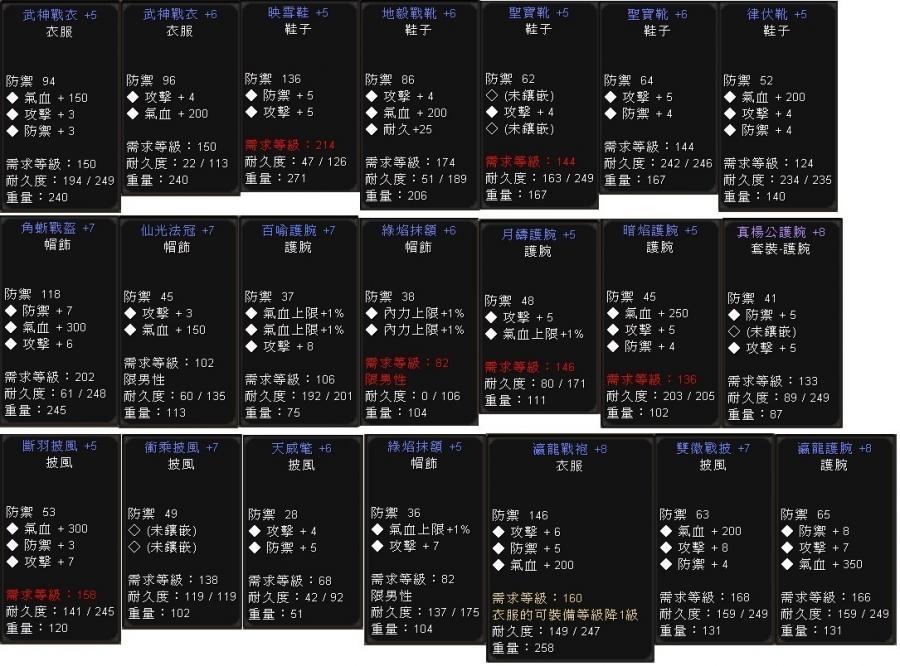 武神戰衣+5耐249-已售出 聖寶靴+5﹙60T﹚ 角蜥戰盔+7﹙330T﹚真楊公護腕+8﹙150T﹚