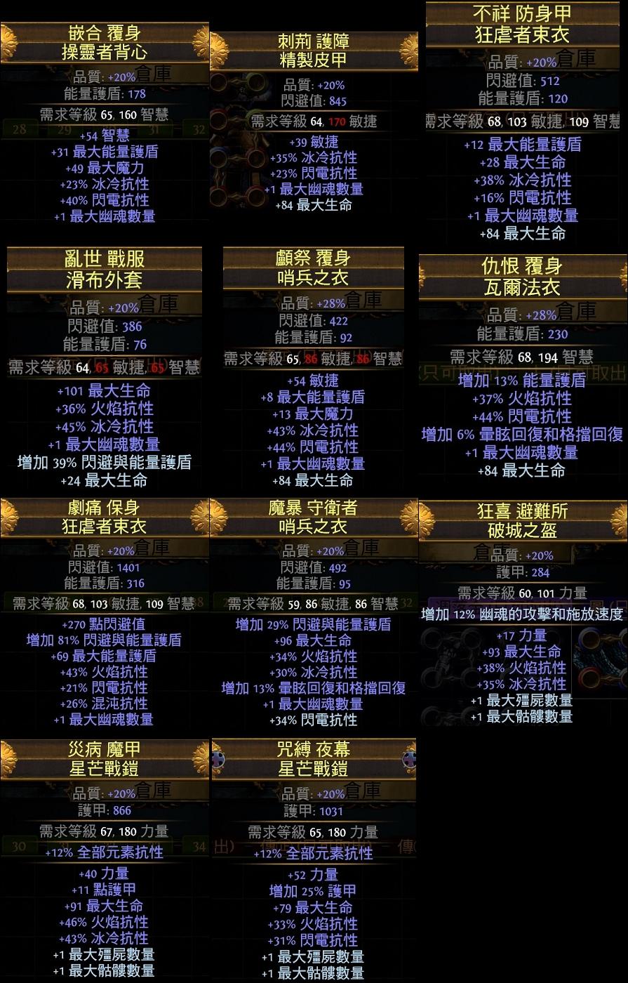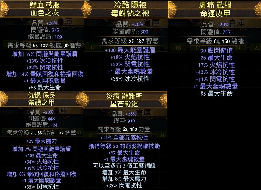 1.幽魂衣:(25%獻祭+詛咒) 、(100%免反射+25%非詛咒光環效果)或其它