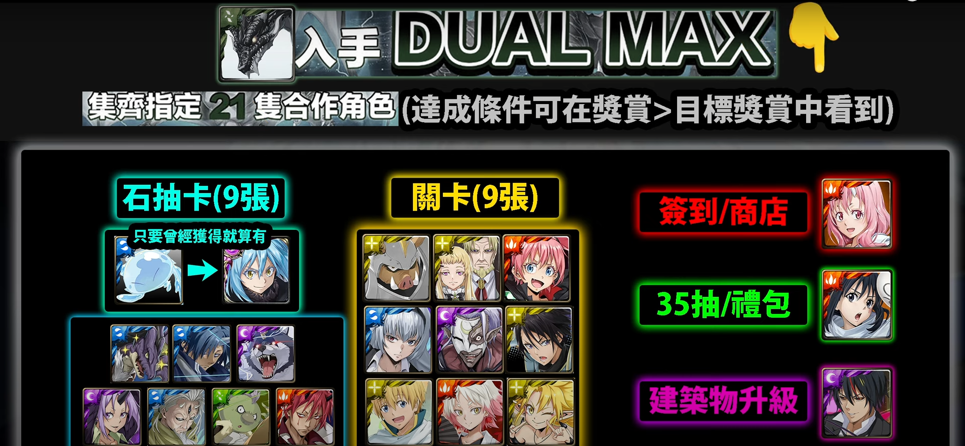 多一隻吞併史萊姆(沒進化前)+暴風龍+魔王利姆路+史萊姆合作全齊21張活動角(如圖一)+合作龍刻+自選西遊ll max+自選希臘神all max+魔法石300顆
