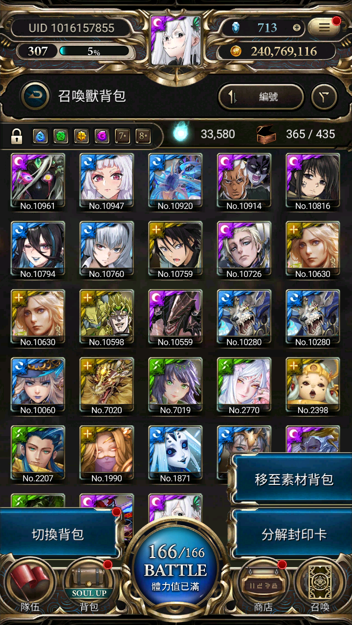 從零開始的異世界生活:合作19張+關卡全過+【闇影君主 ‧ 成振宇究極昇華+我獨自升級+蟻王等21張全齊+龍刻】+莫尼亞蒂+隨機黑金3~8張+隨機白金250~350張+西遊神自選ALL MAX+希臘自選ALL MAX+魔法石400顆以上+週年慶ALL MAX自選+素材+靈魂石+公會鑰匙 2500元(回饋專案)(300級/體驗度高)零進度