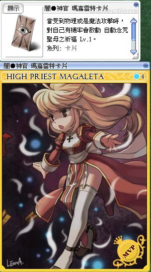 搭配闇●神官 瑪嘉雷特卡片時 DEF+200 MDEF+80 MaxHP+40% 對全屬性攻擊的抗性+15% (好兇猛 開心 開心)