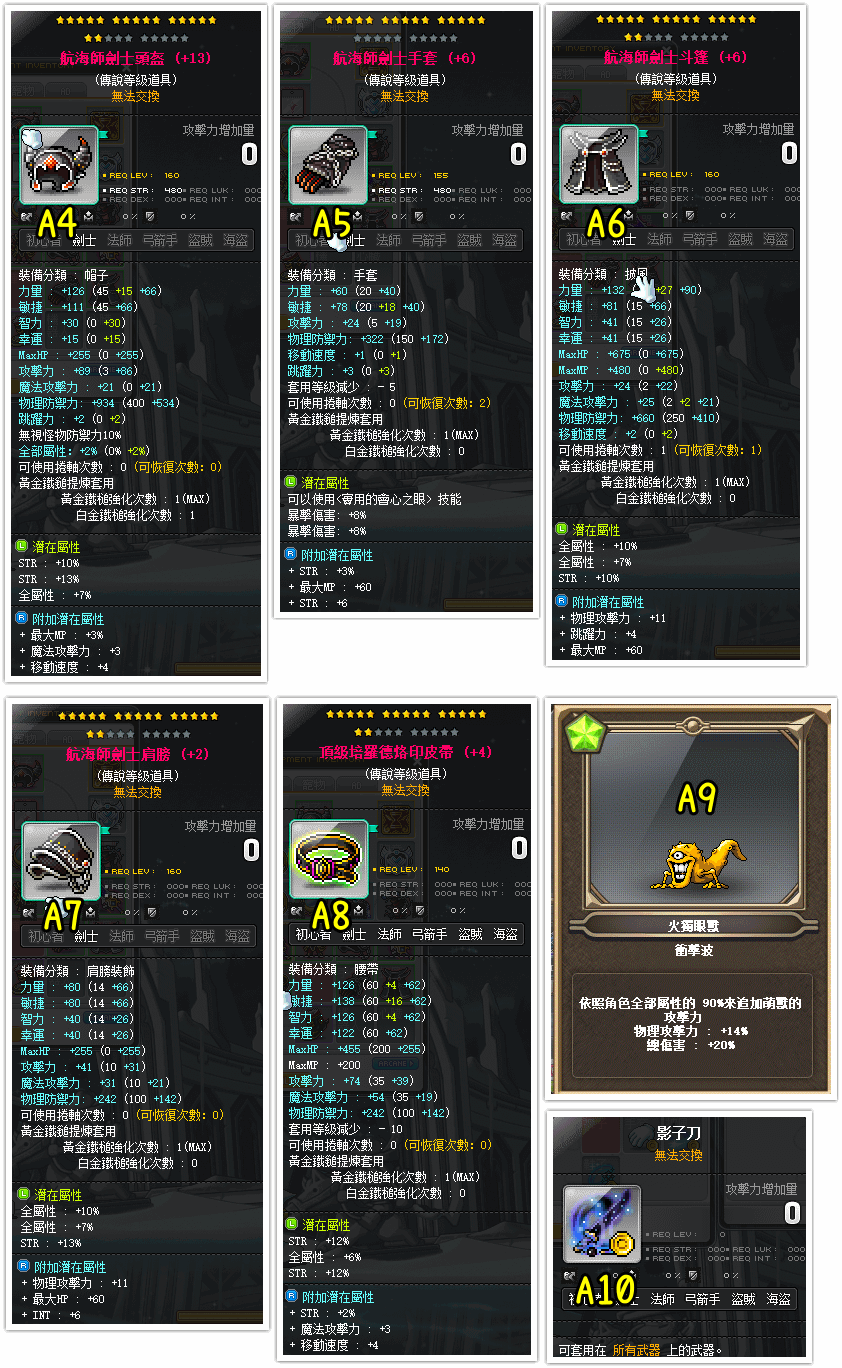 道具 ★頂級%力裝★41%滅龍、39%小魔、38%大魔、航海32%帽子肩膀、露希妲寵物