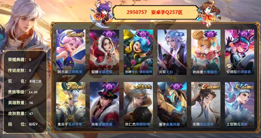 【OBWBGAB588642】貴族5級,171皮膚,0水晶,1典藏,6傳說,7星元,46史詩,8個性按鍵,皮膚價值:131272;【典藏】:瑤拾光映像;【傳說】:貂蟬神驥聚萬邦,張良黃金白羊座,干將莫邪久勝戰神,妲己願照眾生和,雲纓幻光神槍,桑啟鳴野蒿;【星元】:宮本武藏幽冥之眼,妲己美樂蒂之語,小喬HelloKitty,安琪拉橙色警戒,妲己絲絨拿鐵,小喬繽紛彩虹,大喬鄰家女孩;【史詩】:阿軻節奏熱浪,阿軻化蝶舞,大喬貓狗日記,西施織夢人,西施詩語江南,西施至美乘鯉謠,貂蟬聖誕戀歌,弈星萬物之道,小喬線條小狗,小喬繽紛獨角獸,狂鐵龍之律動,楊玉環遇見飛天,明世隱百曉客,安琪拉乘龍聚寶船,安琪拉心靈駭客,花木蘭水晶獵龍者,蒙犽頑巖魄,牛魔星界戰將,鏡真我赫茲,蘭陵王暗隱獵獸者,元歌無心,甄姬冰雪圓舞曲,劉禪紳士熊喵,劉禪天才門將,鬼谷子五穀豐年,妲己女僕咖啡,瑤遇見神鹿,后羿石田雨龍,呂布聖誕狂歡,黃忠百相守夢,少司緣巫禮祀神,娜可露露晚螢,墨子金屬風暴,趙雲皇家上將,趙雲未來紀元,朵莉亞幻珠鮫人,孫尚香水果甜心,孫尚香薔薇戀人,公孫離塗山容容,蒙恬榮光聖徽,李白千年之狐,王昭君偶像歌手,嫦娥拒霜思,宮本武藏鬼劍武藏,曹操幽靈船長,周瑜線條小狗;【年限】:貂蟬神驥聚萬邦,安琪拉乘龍聚寶船,妲己願照眾生和;【珍寶閣】:弈星萬物之道,孫尚香薔薇戀人;:魯班七號班班快跑,孫權徑山謀武,大喬絨語心約,大喬守護之力,東皇太一噬滅天穹,東皇太一金福滿堂,豬八戒潮玩探月行,亞瑟鴻運當頭,西施雪境奇遇,李元芳雲中旅人,李元芳妄想特派,貂蟬長夏之憶,程咬金群星魔術團,空空兒戲夢巡演,扁鵲化身博士,扁鵲無盡旅途,狄仁傑陰陽師,小喬秘證尋蹤,露娜哥特玫瑰,露娜瓷語鑑心,露娜命運加冕,明世隱虹雲星官,張良繽紛繪卷,張良古海尋蹤,張良靈野札記,鍾無豔海灘麗影,安琪拉玩偶對對碰,安琪拉糖果風暴,花木蘭兔女郎,孫臏天使之翼,孫臏歸虛夢演,牛魔西部大鏢客,虞姬溯影追獵,典韋黃金武士,典韋鐵骨偃魂,艾琳鶴鳴心箋,甄姬花好人間,甄姬逆浪荇歌,劉禪喚靈魔甲,劉禪秘密基地,干將莫邪霧都夜雨,鬼谷子幻樂之宴,鬼谷子克喵,鬼谷子天穹祈燈,海諾時空諜影,阿古朵布丁狗之約,莊周錦麟遊夢,影魅影綺裳,妲己紫羅蘭之誓,妲己少女阿狸,項羽海灘派對,達摩拳王,后羿阿爾法小隊,海月幻泉霧影,呂布野性能量,劉邦劍破天穹,羋月紅桃皇后,白起白色死神,少司緣靈卦秘語,太乙真人謐流熔爐,關羽龍騰萬里,魯班大師乓乓大師,魯班大師探海日誌,大司命暗都幽影,朵莉亞金色潮汐,姜子牙星夢巡禮,姜子牙天穹之誓,孫尚香沉穩之力,裴擒虎擒濤扼浪,姬小滿小滿鴨,萊西奧踏浪烽翎,鍾馗虛靈犬護,蒼蒼林狼騎,蒙恬蒼雲破陣,蚩奼極光幻客,李白敏銳之力,王昭君幻想奇妙夜,沈夢溪大漠名商,沈夢溪鯊炮海盜貓,沈夢溪龍舞盛年,戈婭玫藍誓約,桑啟線條小狗,桑啟海鹽詩旅,周瑜熔金海岸,大喬伊勢巫女,東皇太一東海龍王,西施歸虛夢演,女媧尼羅河女神,貂蟬異域舞娘,弈星踏雪尋梅,蔡文姬薔薇王座,狄仁傑錦衣衛,小喬萬聖前夜,楊玉環霓裳曲,明世隱占星師,孫臏未來旅行,蒙犽歸虛夢演,虞姬加勒比小姐,劉禪英喵野望,夢奇美夢成真,瑤森,馬可波羅激情綠茵,暃碧珀緋影,金蟬前塵,司空震啟蟄,老夫子潮流仙人,伽羅花見巫女,諸葛亮星航指揮官,孫悟空西部大鏢客,上官婉兒修竹墨客,雲纓赤焰之纓,蒼維京掠奪者,公孫離花間舞,鎧龍域領主,王昭君精靈公主,雲中君荷魯斯之眼,桑啟畫中遊,嫦娥露花倒影;【個性按鍵】:小喬線條小狗按鍵,周瑜線條小狗按鍵,西施雪境奇遇按鍵,百曉客按鍵,織夢人按鍵,幻珠鮫人按鍵,布丁狗之約按鍵,獵靈按鍵;【主頁裝扮】:神佑建木主頁,元流之子主頁,命歸緣起主頁,群星啟明主頁,穿透信念主頁,巔峰之路主頁,命若星火主頁;【稀有英雄】:_金蟬,_韓信,_娜可露露,_艾琳,_趙雲,_夏洛特,_嬴政,_不知火舞,_橘右京;【手Q90區】【榮耀王者】女號