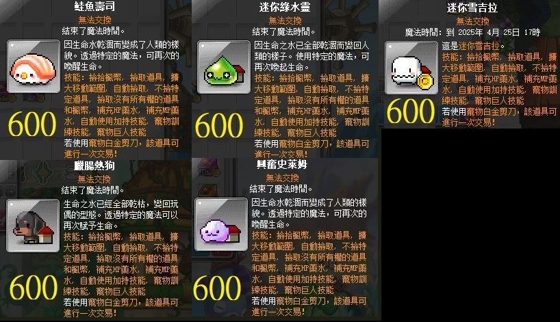 道具 【永久寵物 / 里程寵物 / 職業寵物 鮭魚壽司】 迷你綠水靈 臘腸熱狗 興奮史萊姆 迷你雪吉拉 迷你波波