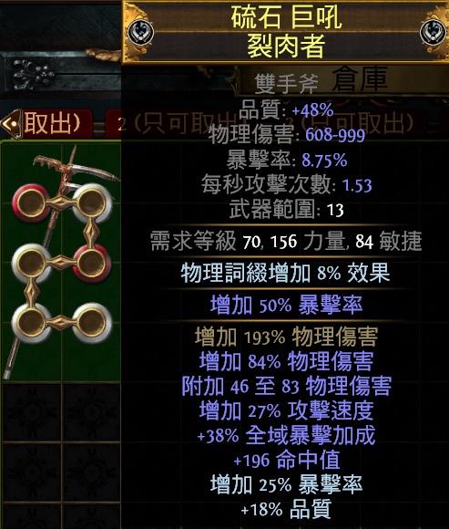 道具 寶飾細劍6T1 DPS754 裂肉者DPS1229 供複製 旋風斬瓦爾巨斧魔鏡子