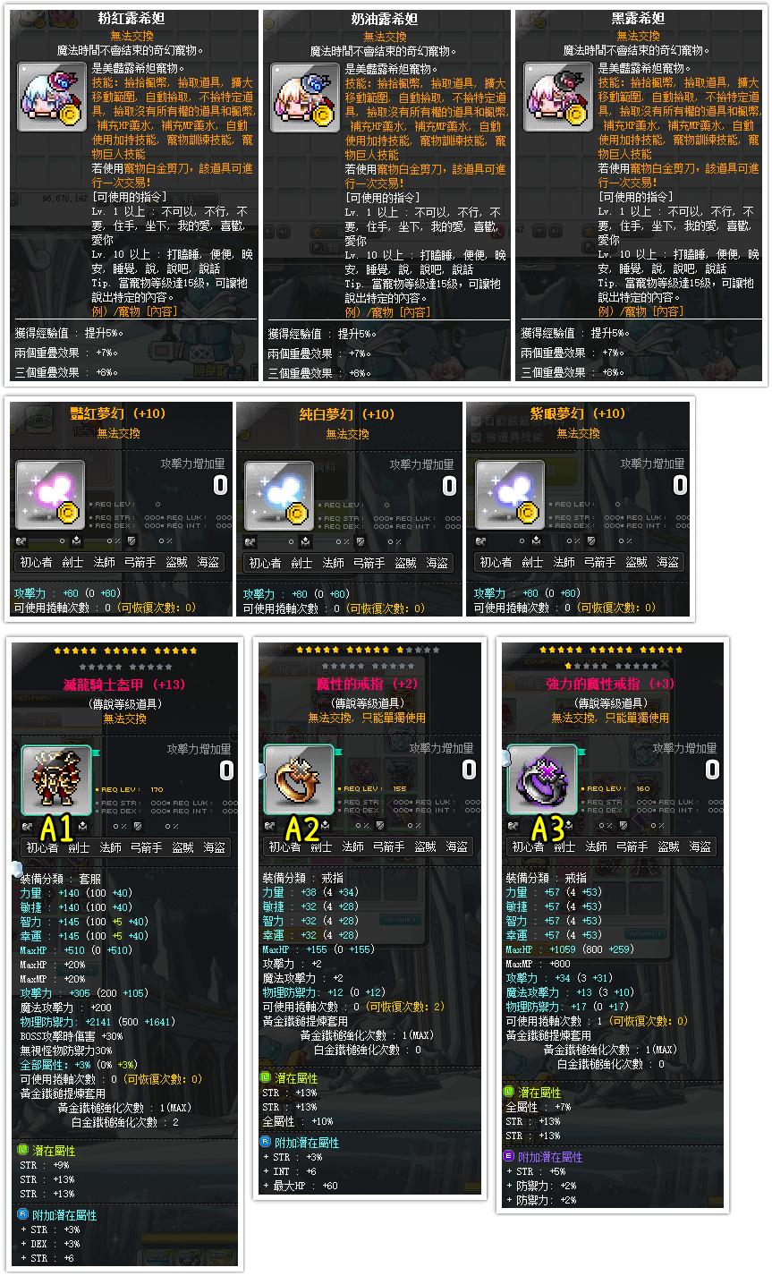 ★頂級%力裝★41%滅龍、39%小魔、38%大魔、航海32%帽子肩膀、露希妲寵物