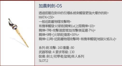 搭配「加農刺劍-OS」時,MATK+30;武器精煉每+2時,「地獄火焰」的傷害+4%。