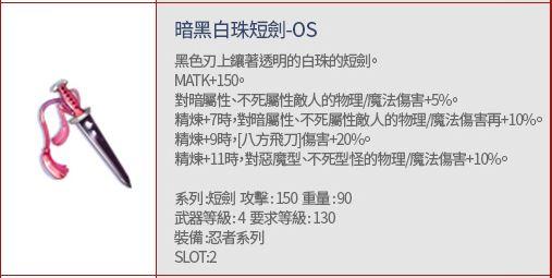 搭配「暗黑白珠短劍-OS」時,水/風/火屬性的魔法傷害+5%;武器精煉每+2時,「火炎花/冰閃槍/風刃」的傷害+3%。