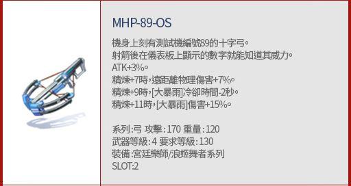 搭配MH-P89-OS時,大暴雨傷害+10%;武器精煉每+2時, 遠距離物理傷害+3%。