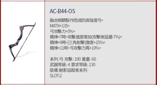 搭配AC-B44-OS時,技能後延遲-10%;武器精煉每+2時, 遠距離物理傷害+3%。