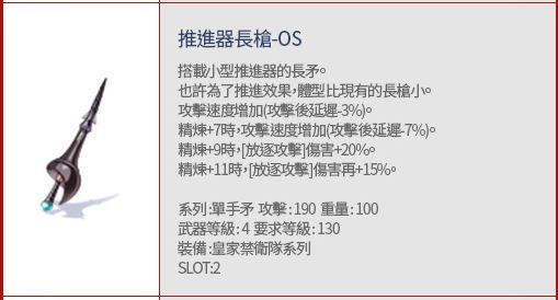 搭配推進器長槍-OS時,ATK+30;武器精煉每+2時, 加農砲攻擊傷害+4%。