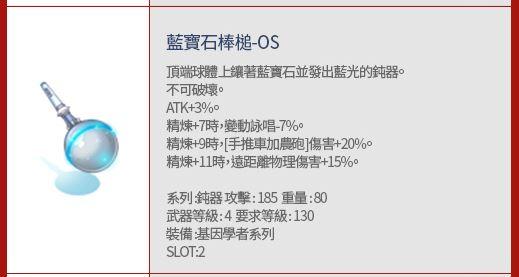 搭配藍寶石棒槌-OS時,ATK+30;武器精煉每+2時,手推車加農砲傷害+4%。