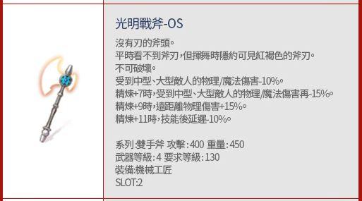 搭配光明戰斧-OS時,MHP+5%;武器精煉每+2時,受到小型敵人的物理/魔法傷害-3%。