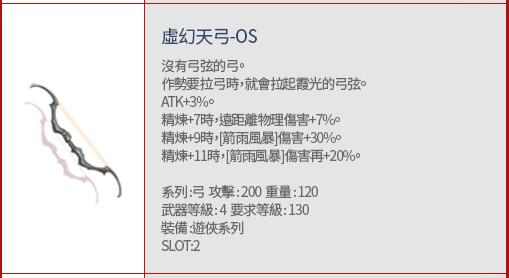 搭配虛幻天弓-OS時,箭雨風暴技能冷卻時間-2.5秒;武器精煉每+2時,弓攻擊力+7%。