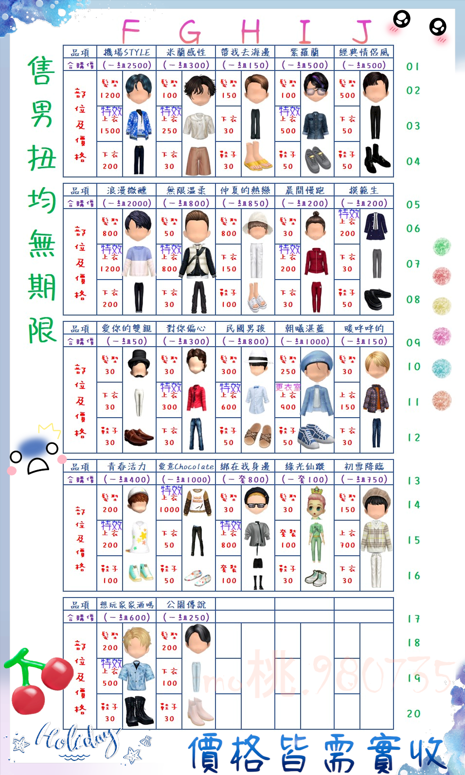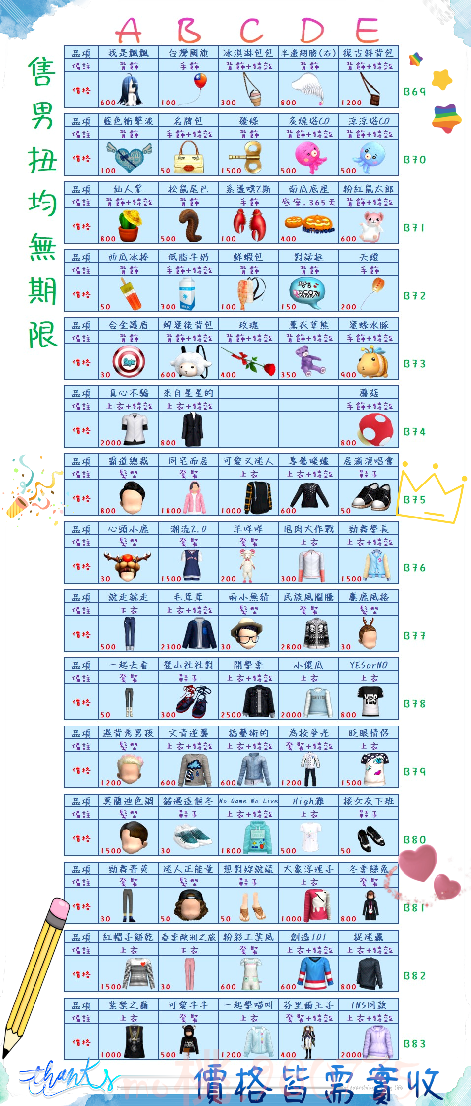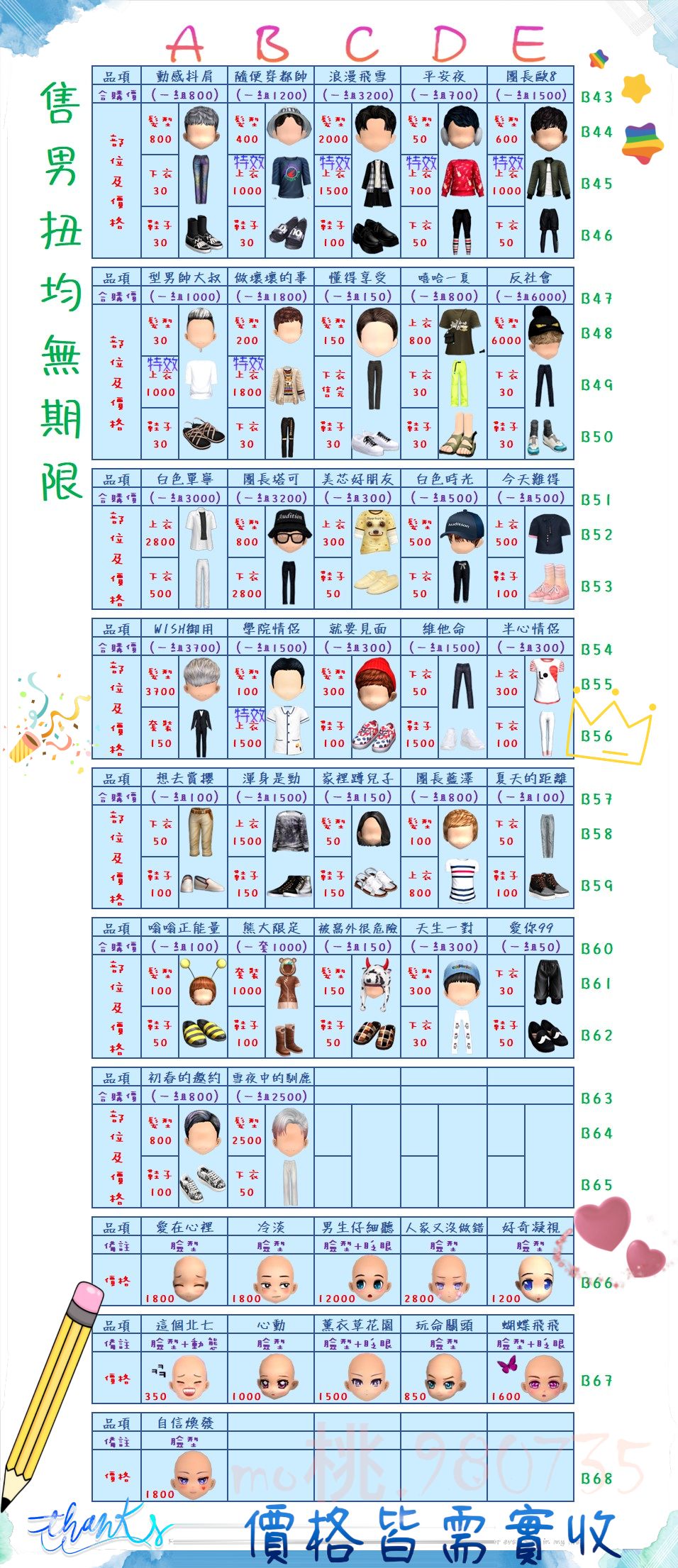 價格都是需要實收,另請先告知男生還女生的在附上編號!