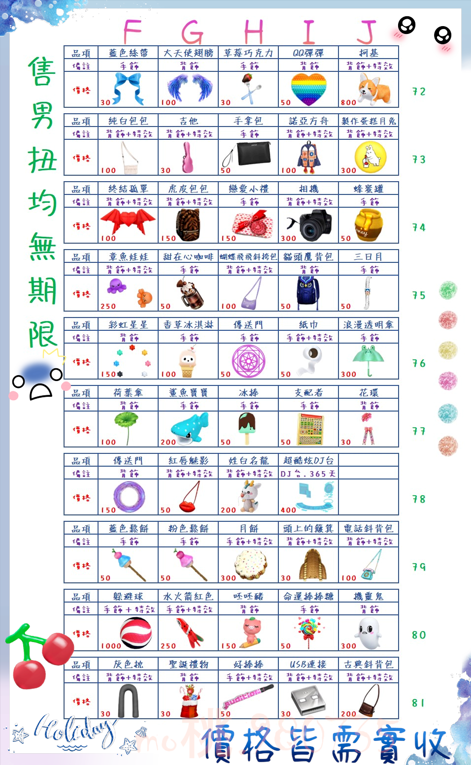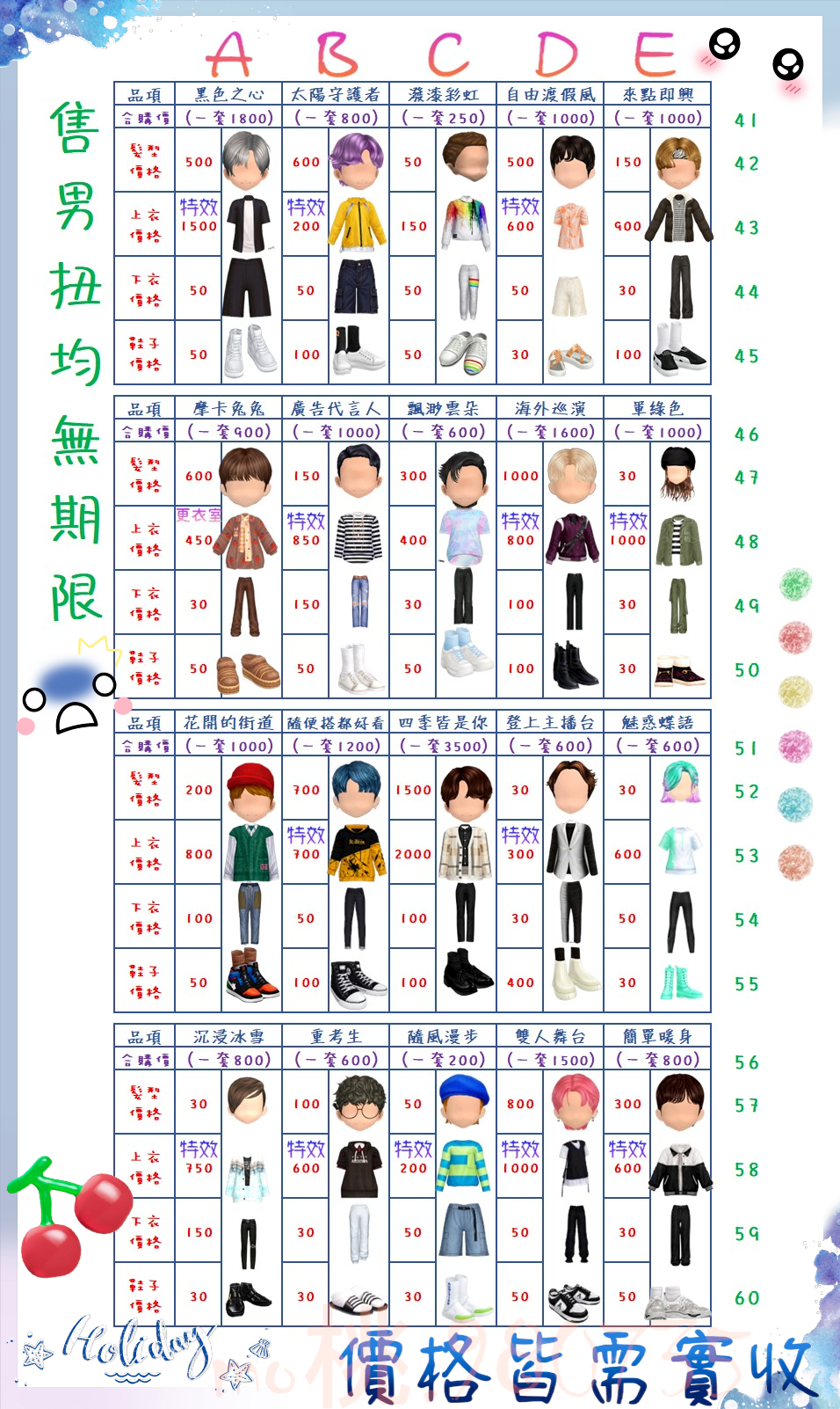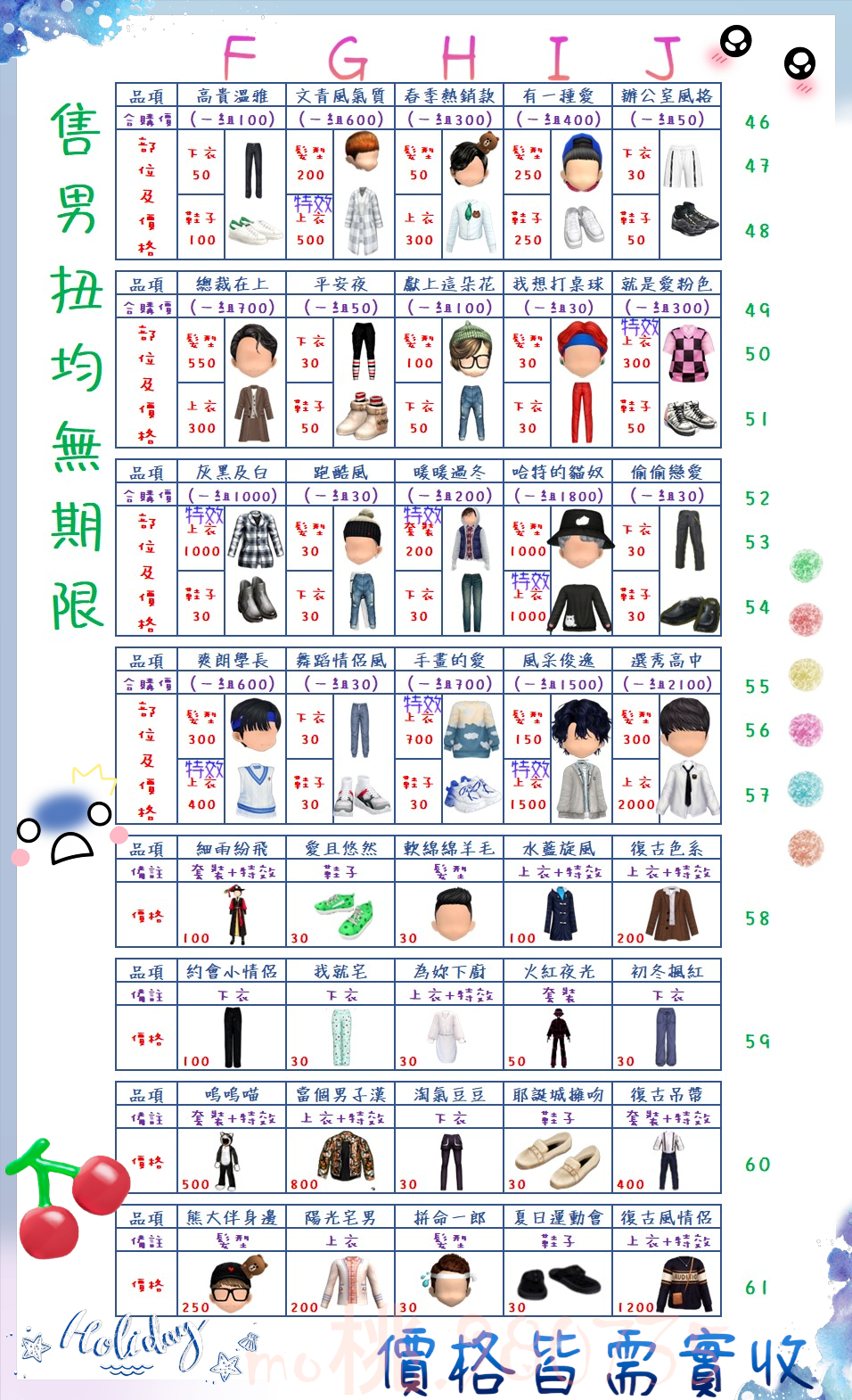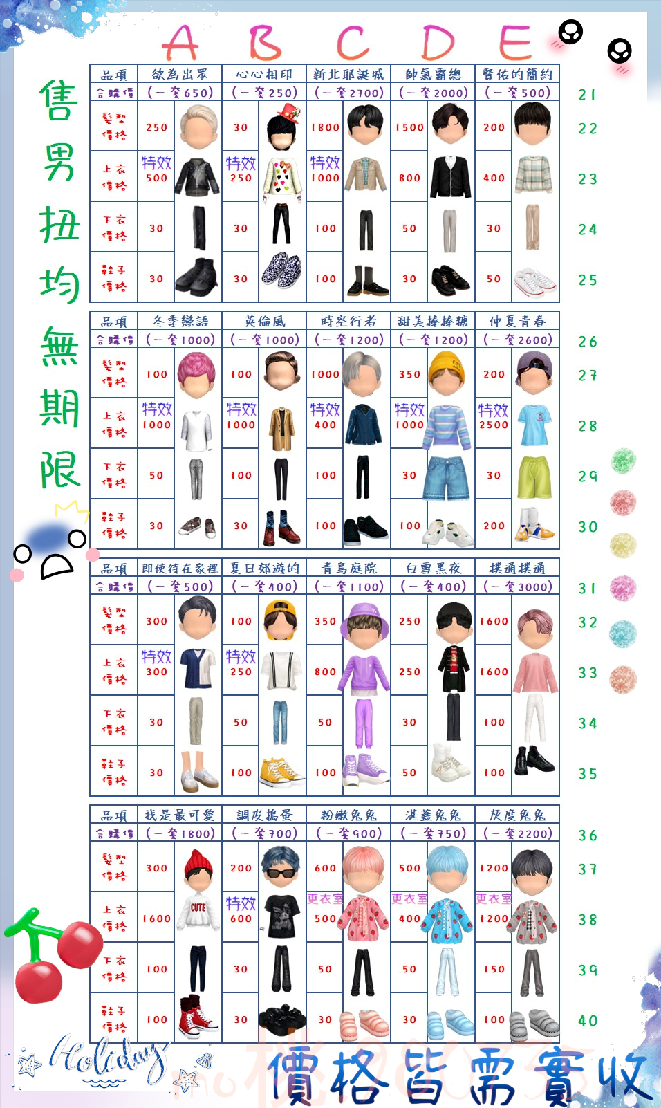 價格都是需要實收,另請先告知男生還女生的在附上編號!