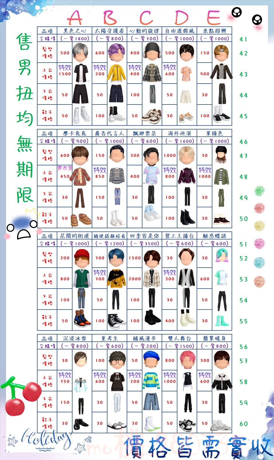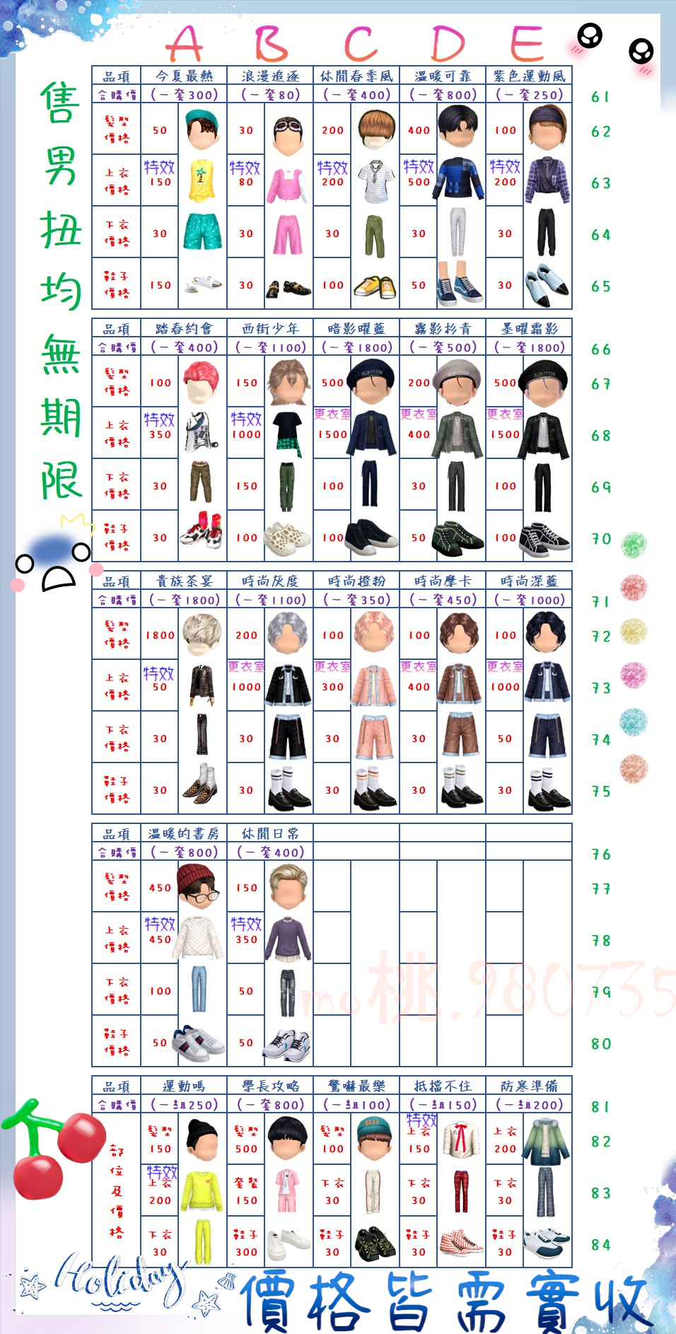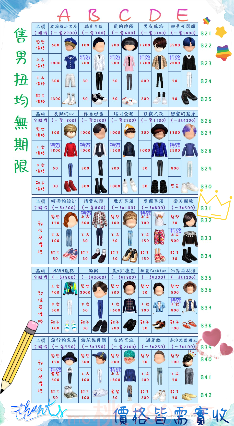 價格都是需要實收,另請先告知男生還女生的在附上編號!