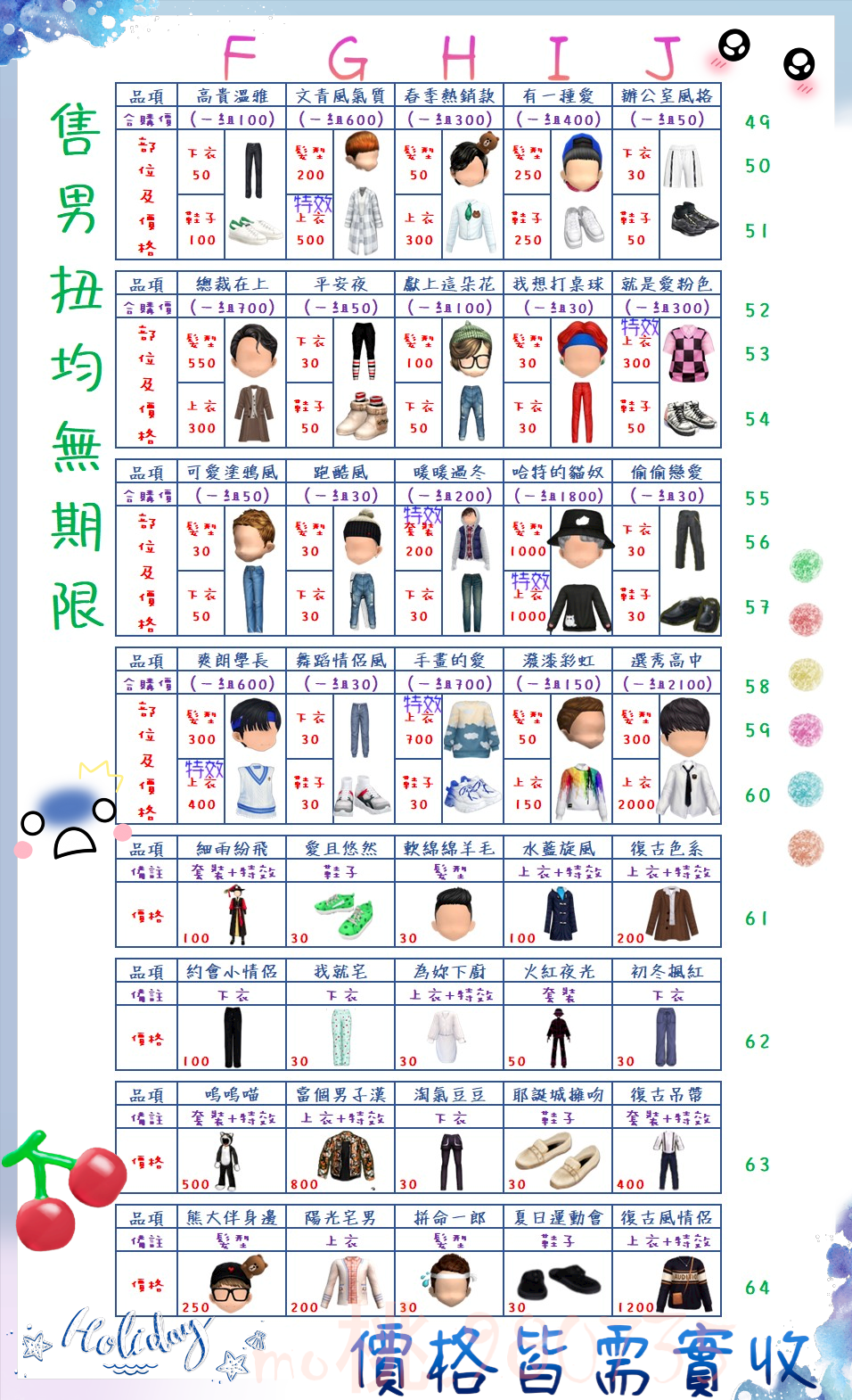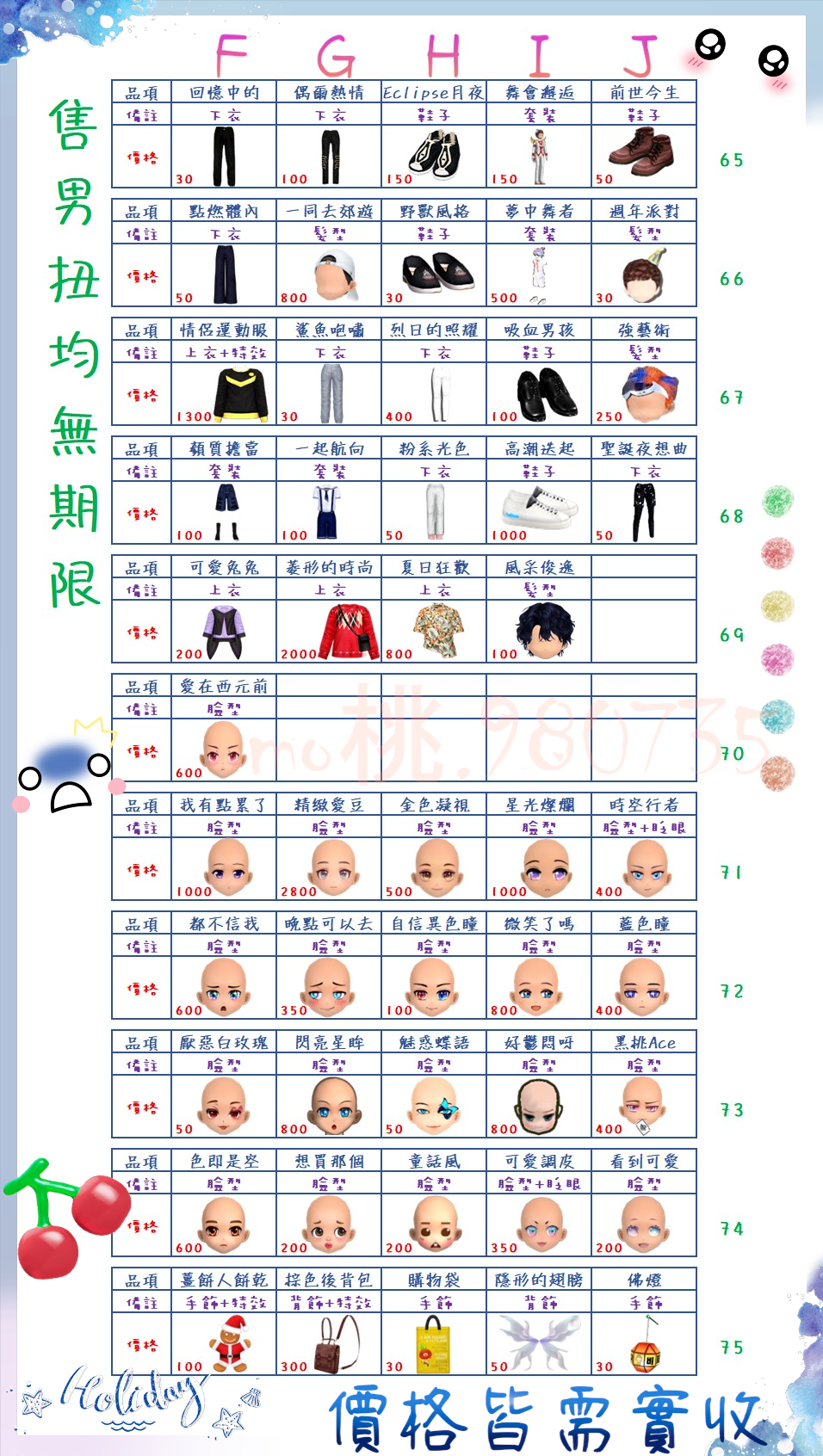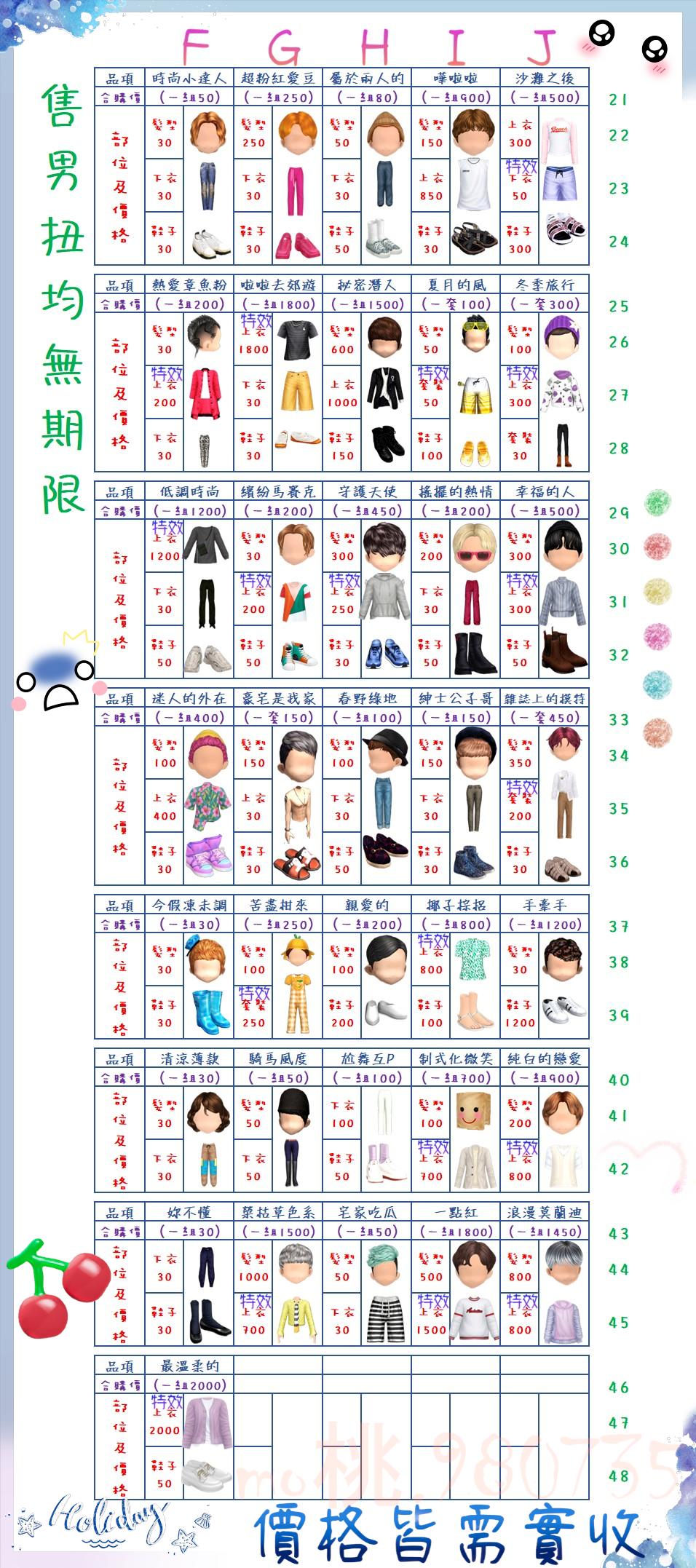 價格都是需要實收,另請先告知男生還女生的在附上編號!