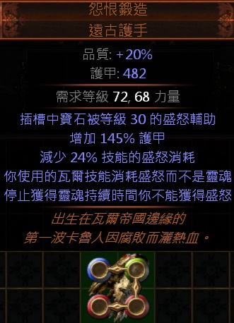 道具 PoE瓦爾靈魂😊傳奇→怨恨鍛造.遠古護手 (寶石被等級30的盛怒輔助)