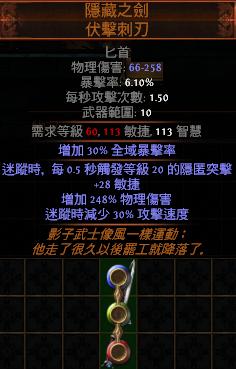 道具 【劫盜*】 隱藏之劍 伏擊刺刃【迷蹤時,每 0.5 秒觸發等級 20 的隱匿突擊】