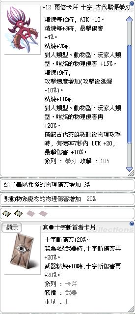 道具 +12古代戰慄拳刃[毒屬3%/動物系20%/真●十字斬首者卡*2]/龍巢幻龜歐茲