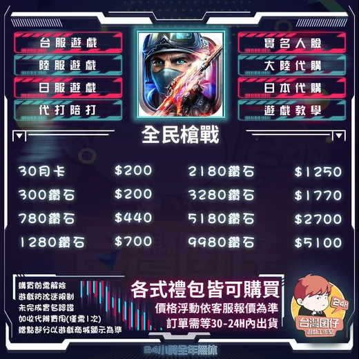 代儲【月卡=330元】 🏆24H客服🏆全民槍戰🔥現貨秒出🔥台灣囝仔🔥退刷包賠🔥