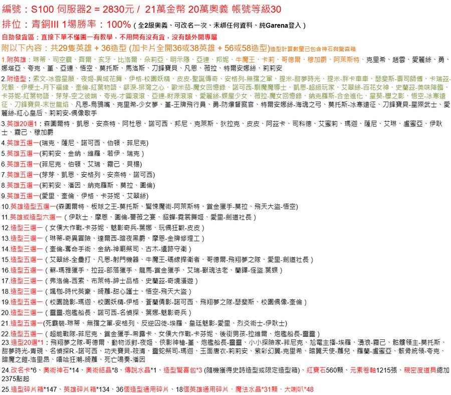 編號:S100 伺服器2 = 2830元 / 21萬金幣 20萬奧義 帳號等級30